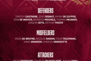 中场:德布劳内(那不勒斯)、拉什金(格拉斯哥流浪者)、蒂莱曼斯(阿斯顿维拉)、瓦纳肯(布鲁日)、范霍特(圣吉罗斯)